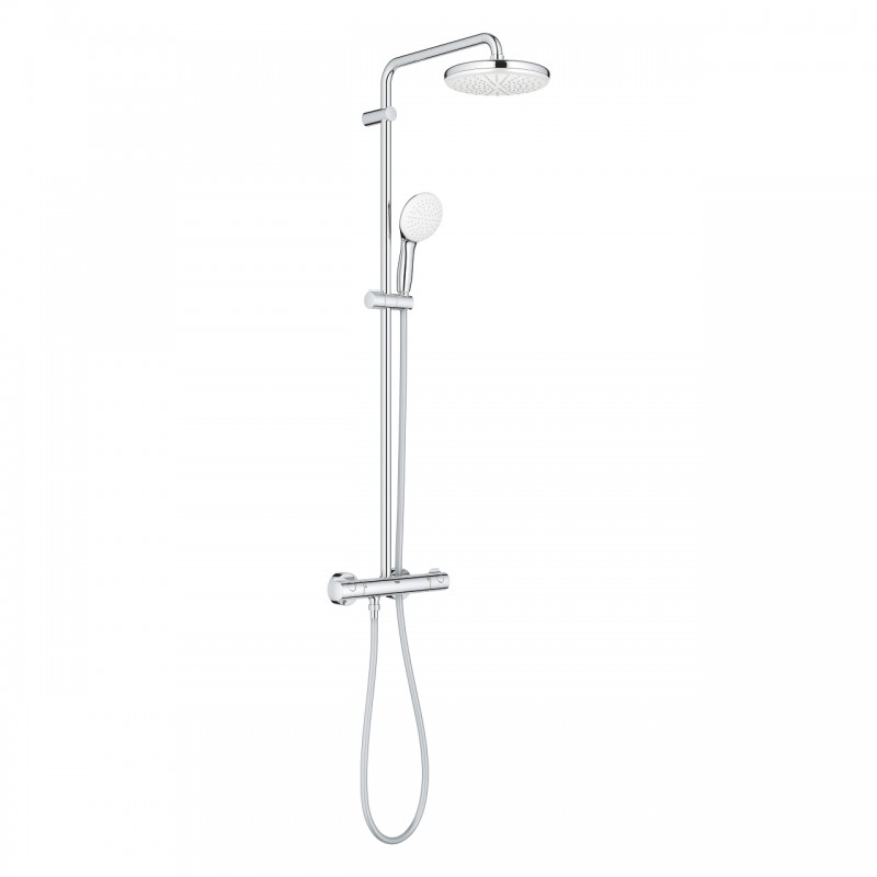 O sistema oferece jato Rain Spray, temperatura constante com tecnologia GROHE TurboStat, proteção contra escaldões com GROHE SafeStop a 38 °C e consumo de água reduzido graças à tecnologia GROHE EcoJoy. O acabamento GROHE LongLife garante maior resistência e facilidade de limpeza ao longo do tempo.