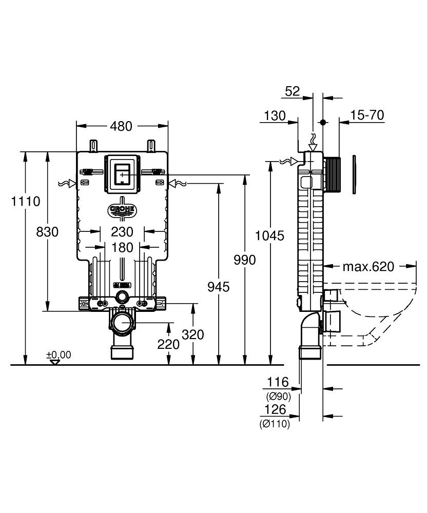 Inclui cisterna GD2 (6‑9 L) e é composto por: Elemento Uniset para WC (38 643 001) Placa de descarga Skate Cosmopolitan, cromada (38 732 000)